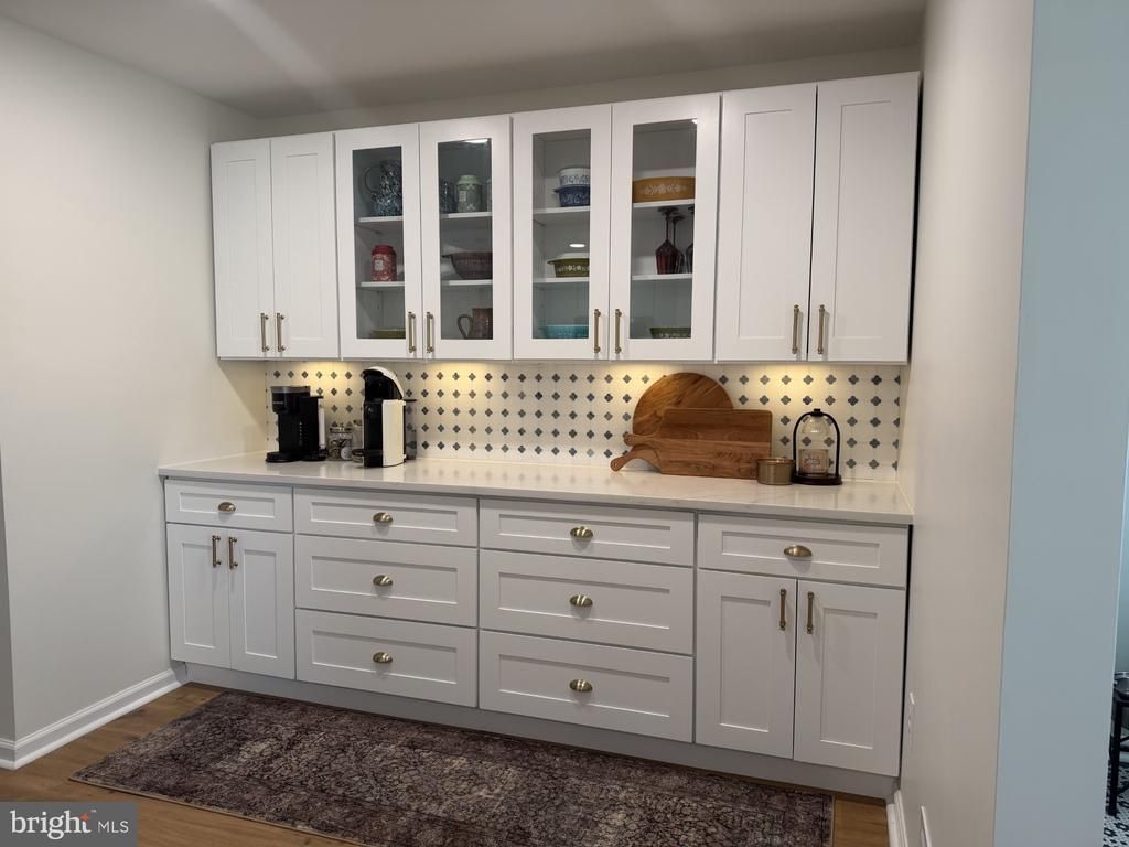 Nothing to do but unpack and enjoy in this fully remodeled end-unit townhome with a one-car garage, where no detail has been overlooked. This extensive renovation showcases high-quality finishes and thoughtful upgrades more commonly found in a custom single-family home. The heart of the home is the completely redesigned kitchen, featuring induction cooking, upgraded appliances, quartz countertops, a designer backsplash, new cabinetry, farmhouse sink, and new flooring. A stunning full wall of custom built-ins with glass-front cabinets creates the perfect space for additional storage, a bar, or a stylish coffee station. Just off the kitchen, the dining area shines with a rebuilt fireplace with brick surround and new Craftsman-style moldings, adding warmth and character. The walk-out lower level offers incredible flexibility as a second living space, home office, gym, or potential third bedroom. This level is complete with its own beverage bar, refrigerator, and sink, making it ideal for entertaining or everyday convenience. Step outside to enjoy a larger-than-average fenced end-unit lot, perfect for outdoor activities, along with a composite deck above for relaxing or hosting. Upstairs, you’ll find two spacious bedrooms, each with its own beautifully remodeled en-suite bath. The primary suite has been thoughtfully redesigned to include a separate soaking tub and shower, elevating both function and style from the original layout. Ideally located near Cosner’s Corner, you’ll enjoy easy access to shopping, dining, and I-95, making commuting a breeze. The sought-after Lee’s Hill community offers a wealth of amenities including a swimming pool, tennis and pickleball courts, playgrounds, picnic pavilion, and scenic paved walking paths. This is truly a one-of-a-kind opportunity combining location, lifestyle, and top-to-bottom renovation.